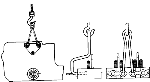 При снятии тяжелых сборочных единиц дизеля зачаливать их, как указано на рис. 27-36.