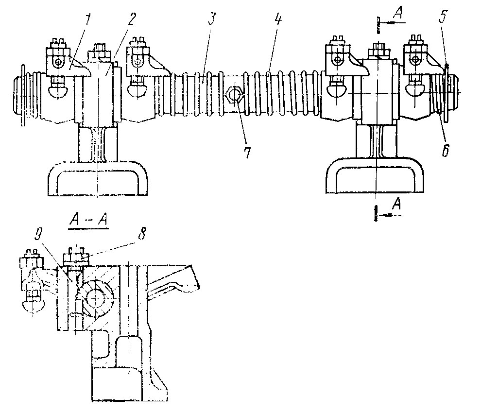 Зашплинтуйте валик и наденьте на него последовательно шайбу 5, короткую пружину 6, коромысло, стойку, второе коромысло, пружину 4, третье коромысло, стойку, четвертое коромысло, короткую пружину и шайбу. Зашплинтуйте валик с другого конца и окончательно запрессуйте оправкой стопоры в стойки. Стопоры должны сесть в пазы валика коромысел. Наверните на несколько оборотов на стопоры гайки 8 с шайбами.