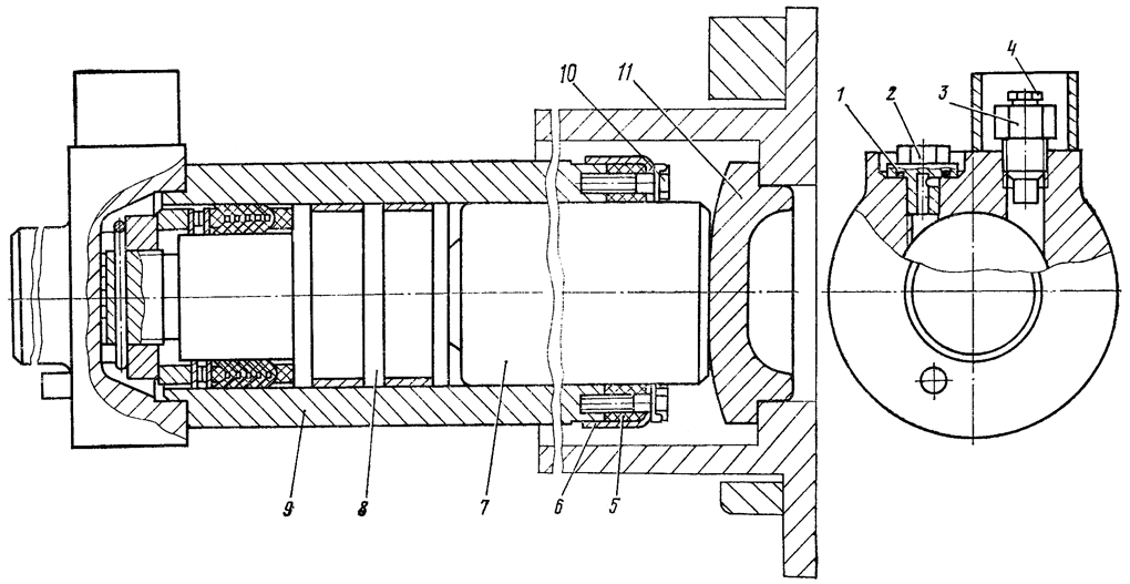 Расстопорите болты 10 ( рис. 296 ) и выверните их. Снимите крышку 6 сальника и сальник 5. Выверните пробку 4 из клапана 3. Нагнетанием солидола через клапан 3 выдавите из цилиндра 9 шток 7 и поршень 8 с деталями уплотнения.