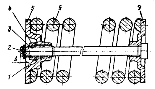 Сожмите пружину механизма сдавания, завернув гайку 4 ( рис. 299 ) торцовым ключом так, чтобы размер А между торцами гайки и стержня 3 был равен 40...45 мм.