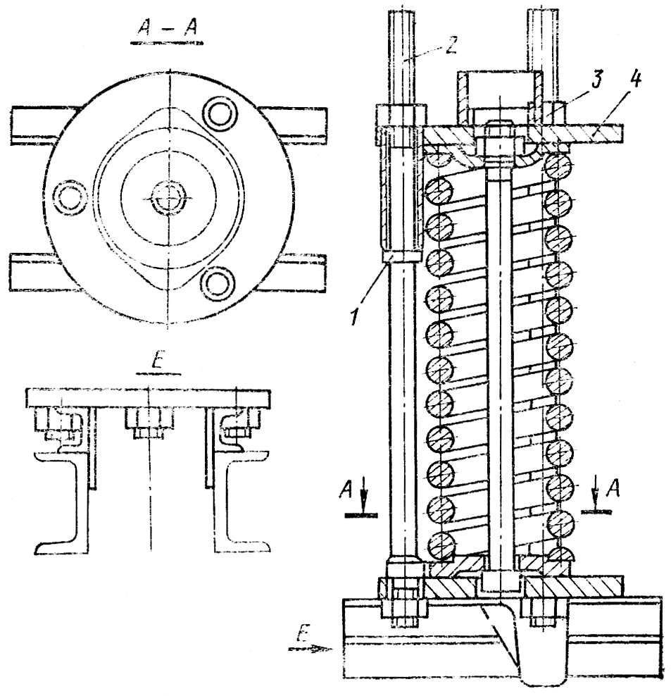 Наденьте на стержень 3 фланец 7 и установите стержень с фланцем в приспособление ( см. рис. 300 ). Установите пружину 6 ( см. рис. 299 ) и фланец 5 на стержень. Наденьте на штанги приспособления нажимную шайбу 4 ( см. рис. 300 ) и наверните гайки 3. Установите приспособление с механизмом натяжения на пресс. Сожмите пружину до упора втулки нажимной шайбы в контрольное кольцо 1. Затяните гайки штанг и отведите шток пресса.