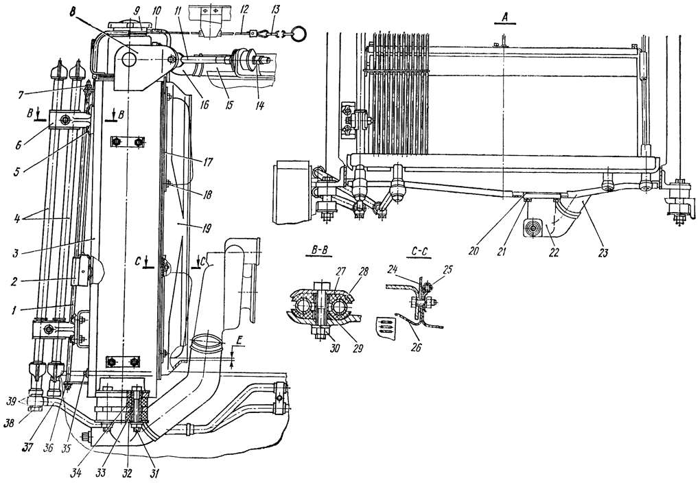 Ослабьте задние гайки 14 крепления раскосов на гидробаках, отверните гайки с болтов проушин 8 радиатора и отсоедините раскосы 11 от радиатора.