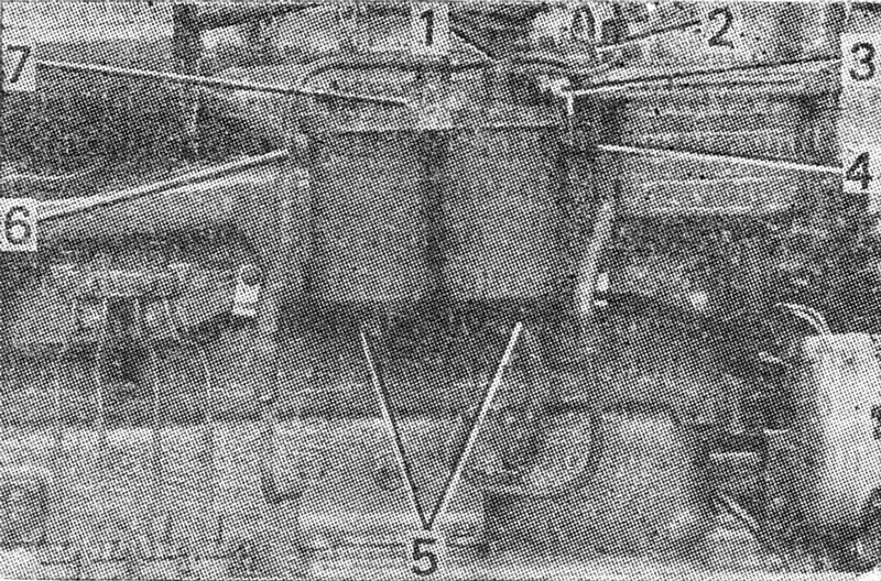 Слейте топливо из топливного фильтра, отвернув продувочный вентиль 1 ( рис. 146 ) и вывернув пробки 5. Отсоедините сливную трубку 2 от продувочного вентиля. Отсоедините топливопроводы 4 и 6 от корпуса фильтра 7. Отсоедините провод от датчика 3 указателя давления топлива. Отверните две гайки со шпилек крепления топливного фильтра к водоотводной трубе и снимите фильтр 7.
