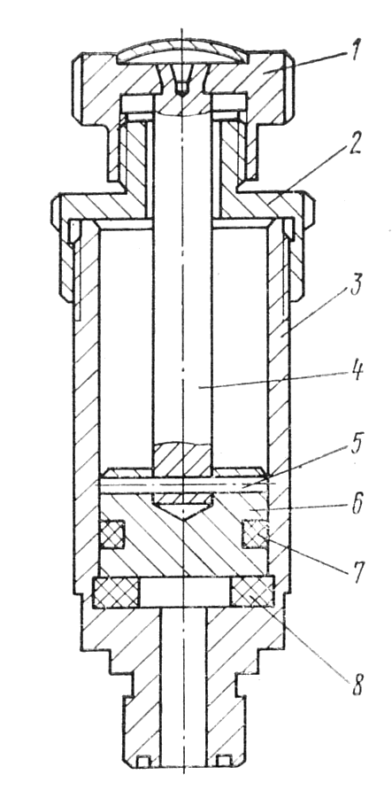 Выверните крышку 2 ( рис. 142 ) из корпуса цилиндра 3 и выньте из него рукоятку 1 со штоком 4 и поршнем 6. Выбейте штифт 5 и снимите поршень со штока. Выньте, при необходимости, из цилиндра прокладку 8 и снимите с поршня резиновое кольцо 7.