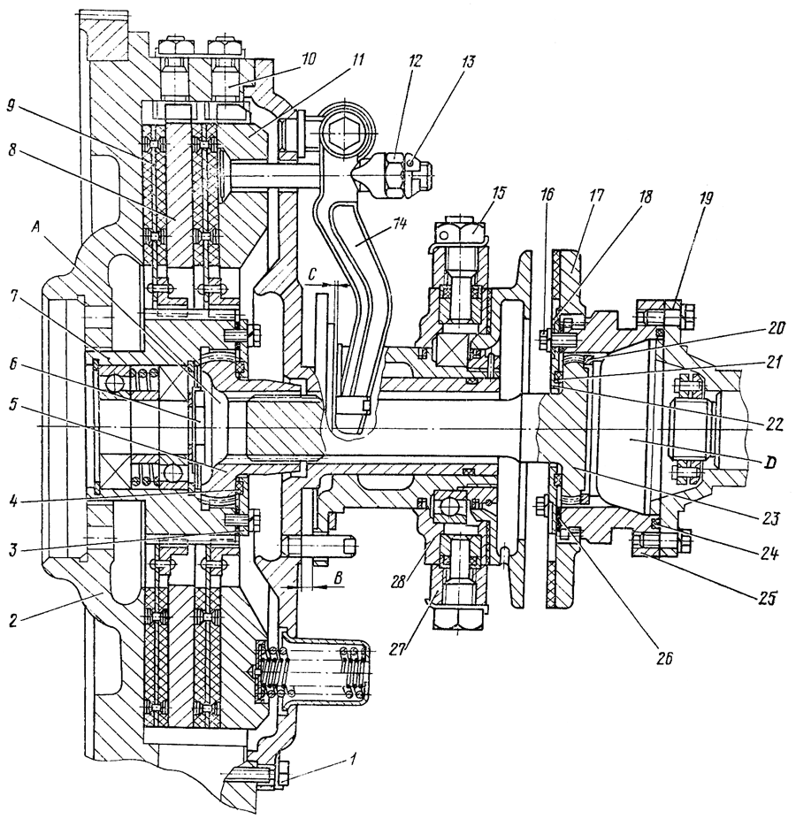 Для установки рычагов 14 в нужное положение отодвиньте ползун муфты включения от фланца на размер В=(10±1) мм и наверните регулировочные гайки до легкого касания рычагов 14 поверхности упорного кольца муфты включения. Зазор между рычагами и упорным кольцом в этом положении должен быть С=0...0,2 мм. Гайки 12 зашплинтуйте проволокой 13.