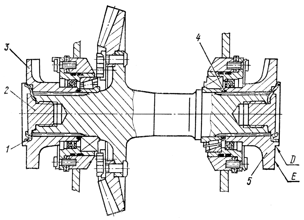 5. При вращении вала в подшипниках биение поверхностей фланцев: радиальное биение поверхности D ( см. рис. 226 ) не более 0,2 мм, торцовое биение поверхности Е не более 0,25 мм.